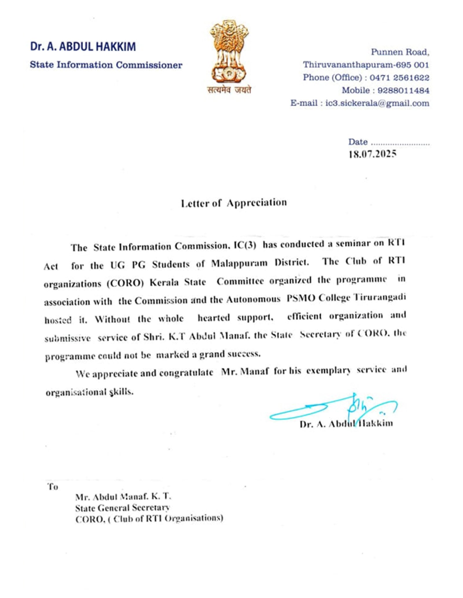 RTI 2005 ആക്ടിന്റെ എല്ലാ അന്തസ്സും മുറുകെ പിടിച്ചു അതിനെ പൊതു സമൂഹം വഴി പ്രാവർത്തികമാക്കുവാൻ പാട് പെടുന്ന നല്ലവരായ സംസ്ഥാനത്തെ വിവരവകാശ പ്രവർത്തകരെയും, പൊതു പ്രവർത്തകരെയും ബഹു. സംസ്ഥാന വിവരാവകാശ കമ്മീഷനെയും, വ്യത്യസ്ത രീതിയിൽ വളരെ ഉപകാരപ്രദമായ ഇടപെടൽ നടത്തി, നല്ലതായ ഉത്തരവുകൾ, ഉപദേശ മാർഗ്ഗ നിർദ്ദേശങ്ങൾ എന്നിവക്ക് നേതൃത്വം നൽകുന്ന ബഹു. കമ്മീഷണർമാരെയും ഇവിടെ അഭിനന്ദനങ്ങൾ അർപ്പിക്കുന്നു. ഇവരുമായി കൂട്ട് ചേർന്ന് നല്ല പ്രവർത്തനം കാഴ്ച്ച വക്കുവാനും ഞങ്ങൾ ഏതവസരത്തിലും തയ്യാറാണ്. അതോടൊപ്പം നിയമ പരമായ ചട്ടകൂടുകളിൽ നിന്ന് അനുവദീയമായ രീതിയിലുള്ള പൂർണ്ണ സഹായ സഹകരണം ഞങ്ങളും ഇവരാൽ പ്രതീക്ഷിക്കുന്നു!