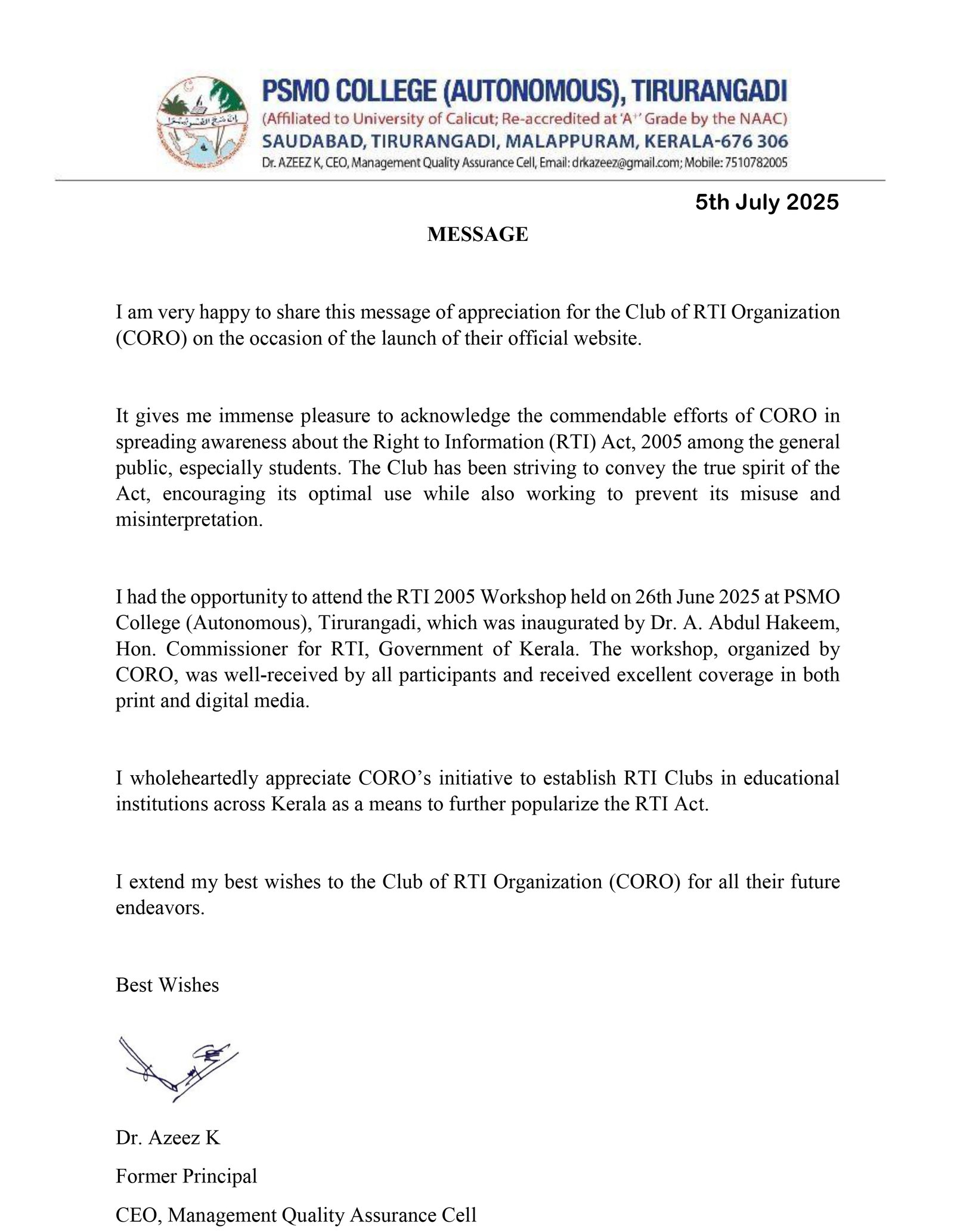 പബ്ലിക് സർവീസ് കമ്മീഷൻ, KILA (ലോക്കൽ സെൽഫ്) മുതലായ സർക്കാർ സംവിധാനങ്ങളിൽ കൂടി RTI ACT 2005 ( വിവരാവകാശ നിയമം )എന്ന ഇന്ത്യൻ പാർലമെന്റ് പാസ്സാക്കിയതും, ഇന്ത്യൻ ഭരണ ഘടനക്ക് സമാനമായ തുല്യ അവകാശം എന്ന ഈ മഹാ സംവിധാനം പൊതു സേവകർക്ക് അറിവ് പകർന്നു നൽകുവാൻ സർക്കാർ സംവിധാനങ്ങൾ ഉണർന്ന് പ്രവർത്തിക്കുക എന്നതിലേക്ക് CORO എന്ന അസോസിയേഷൻ ഏതു വിധേനയും പ്രവർത്തിക്കാൻ പ്രതിജ്ഞബന്ധരാണ് എന്നത് കൂടി ഇവിടെ പങ്ക് വക്കുകയാണ്. ആയത് സർക്കാരും, വകുപ്പ് മേധാവികളും ഗൗനിക്കുമല്ലോ!!